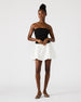 This AMARI mini dress features a stretch knit top and a bubble-hem skirt for both comfort and style. The side zip and elastic provide a secure fit. while the fully lined. strapless design and ruched side seam bodice add a touch of elegance. Perfect for any occasion with its slightly dropped waist.