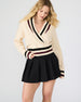Accented with varsity-inspired striping. ADDISON is a versatile pullover sweater with a faux wrap that you can wear on or off the shoulders.