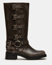 The ROCKY BROWN DISTRESSED WIDE CALFÂ knee boot features the wide profile of an engineer boot with harness and buckle hardware adding an industrial edge and giving the design an adjustable fit.